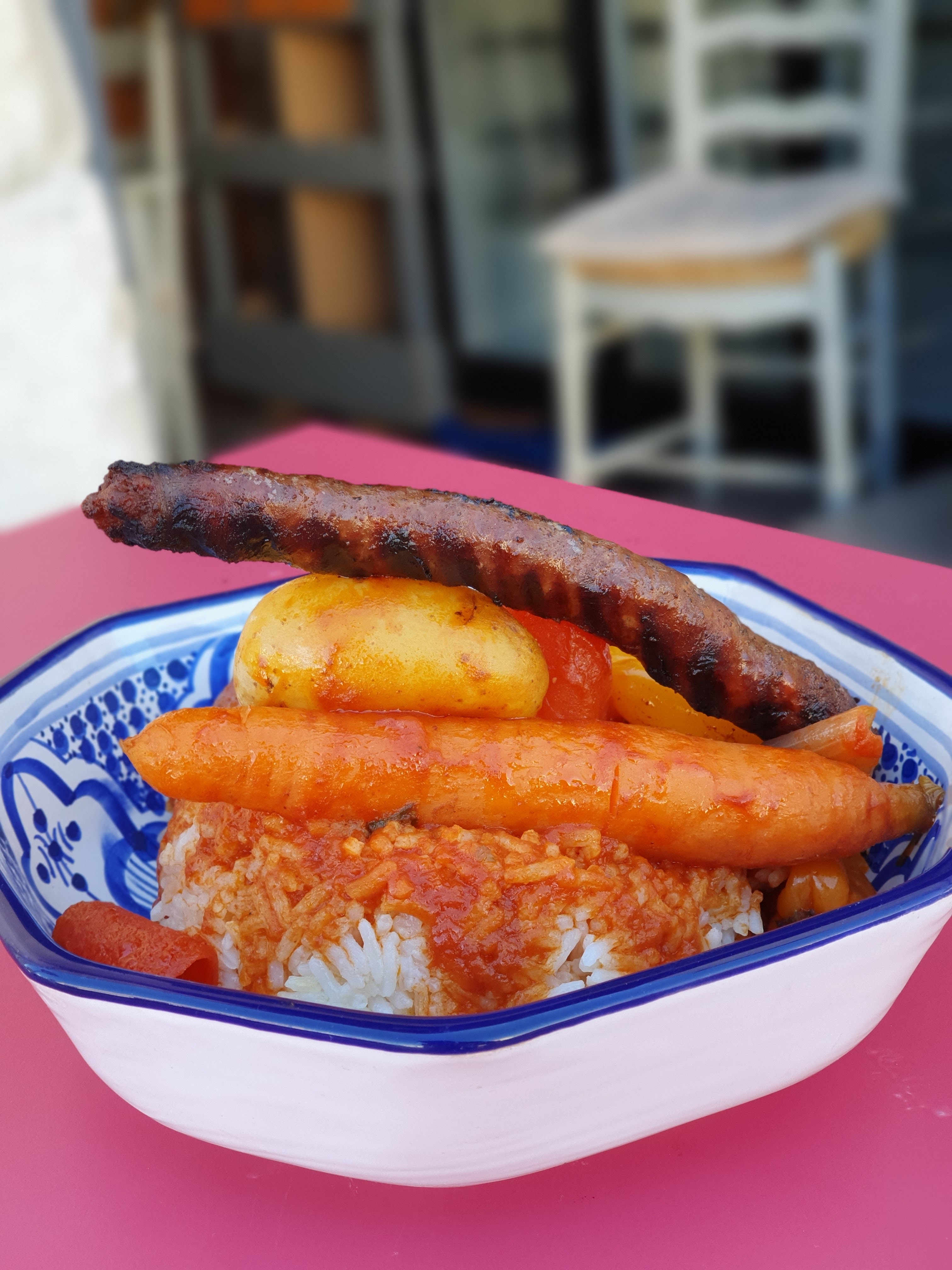 Le couscous nuage de Zidane est vraiment délicieux : délicat et savoureux, on voit qu'il le cuisine avec amour. Il était très gentil, il nous a aussi donné des dattes avec de la pâte d'amande à l'intérieur. Si vous êtes dans le coin, ne le manquez pas, allez-y tôt car il est très demandé.