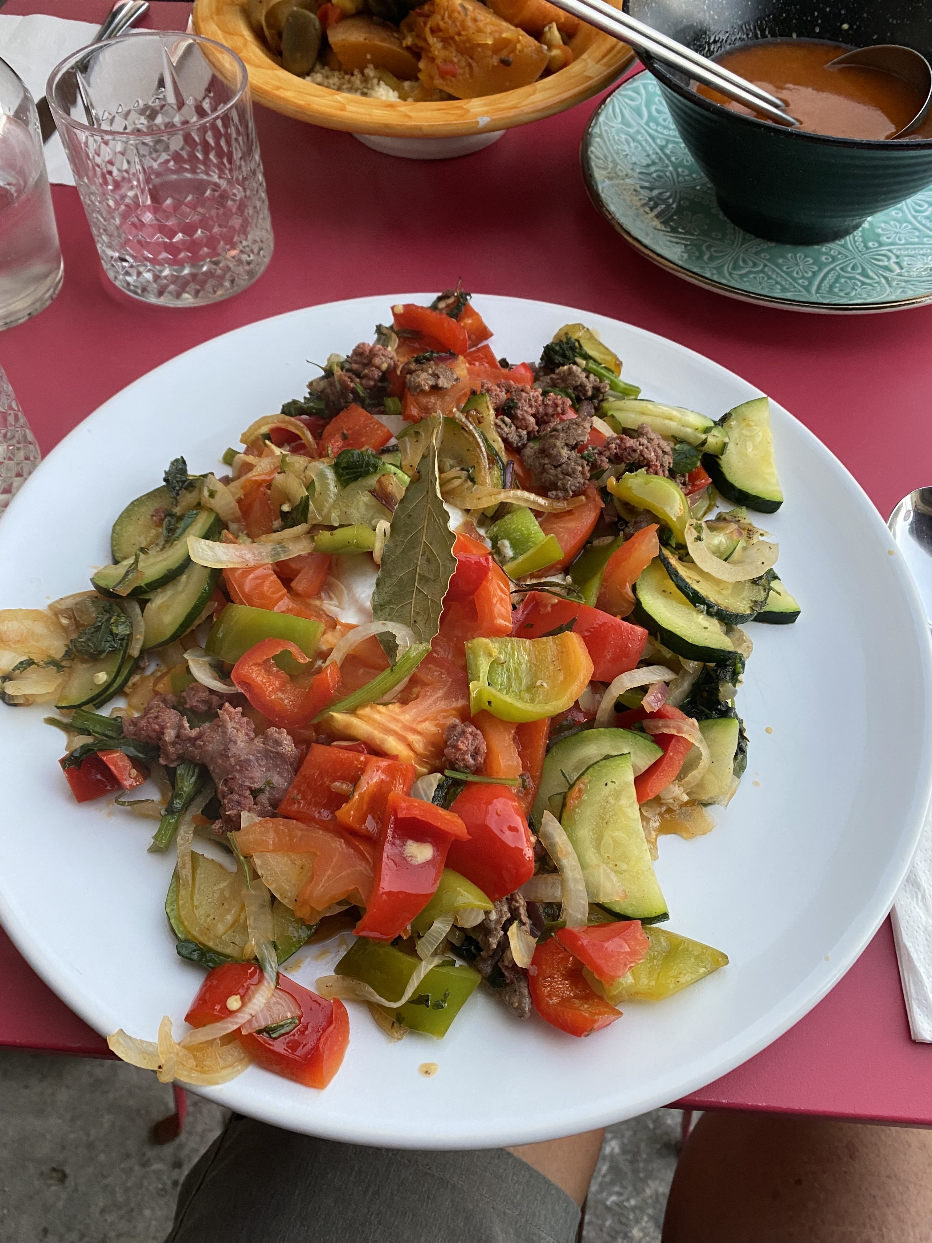Excellent couscous tunisien avec des produits frais, du vrai fait maison avec des legumes frais et des produits du pays, donc je conseille l endroit. Le cadre est tres moyen on a l impression que c est en plein demenagement ou en travaux. Par contre le prix a 25 euros juste pour le couscous nous a semblé un peu cher. Patisseries tres bonnes faites maison a 3 euros pieces.