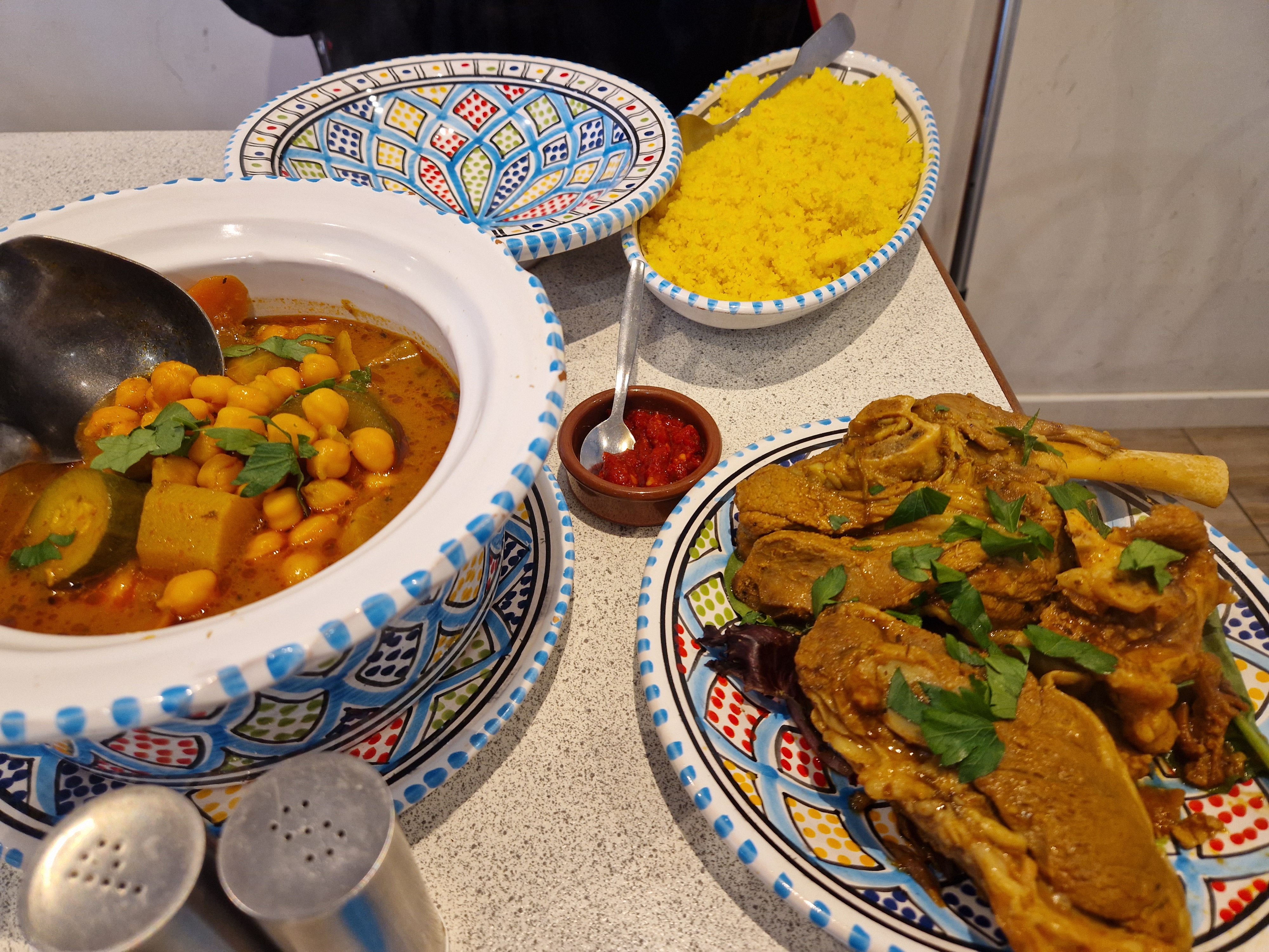 Arrivées 13h, salle bondée. Nous sommes 2, on partage une table avec une personne seule avec plaisir. Il ne reste déjà plus beaucoup de choix du au succès du restaurant. Nous optons pour le couscous à l'agneau. Le bouillon est riche en saveurs et épices. La viande fond dans la bouche. Peut-être pas assez de légumes. Le serveur est super sociable et adorable. Je recommande.