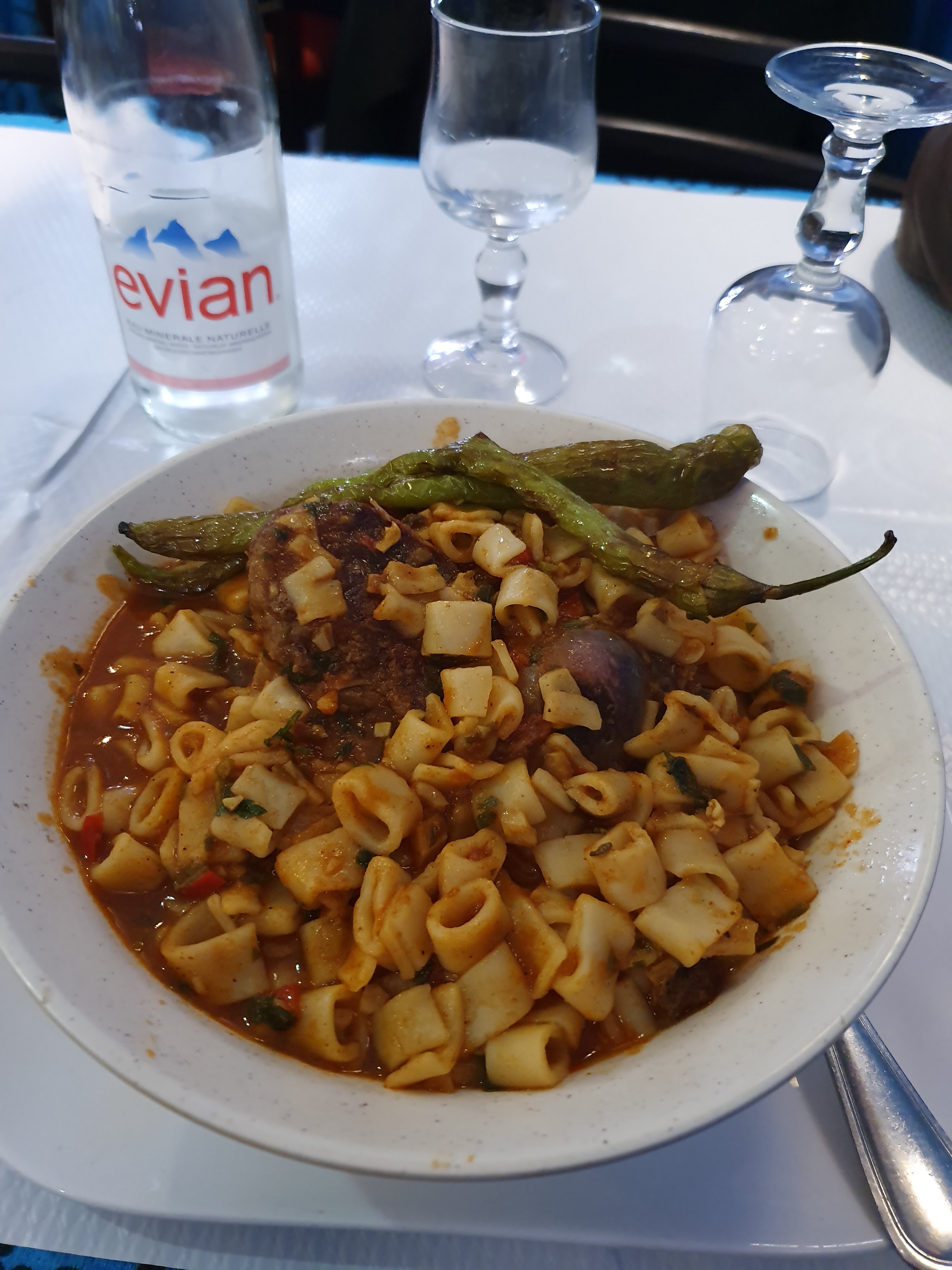Ambiance sympa ,plan de table atypique, tajine agneau pruneau bien cuit mais présentation des plats a revoir. Complet poisson complètement raté la dorade ressemblait à une sardine,salade méchouia bof et surtout la présentation des plats a revoir.