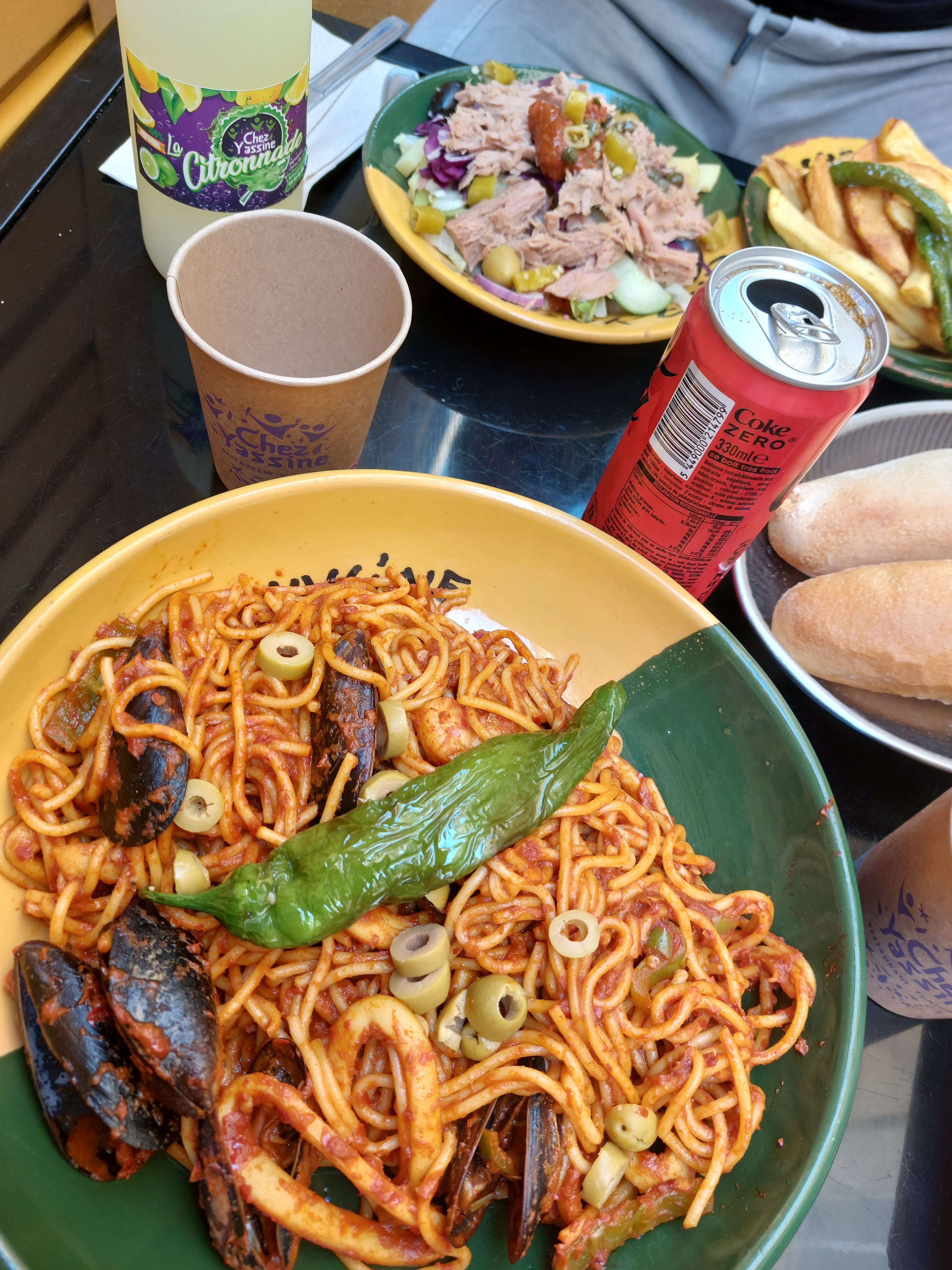 C'est bon Chez Yassine (cuisine tunisienne) à Noailles (13001). On se croirait à Tunis ! Les Spaghettis Fruits de Mer et la Salade Mechouia que j'ai prit à emporter c'était super bon ! J'ai croisé une dame qui habite à Salon de Provence qui à fait le déplacement jusqu'à Marseille pour venir manger Chez Yassine 😁 Je suis satisfaite de ce restaurant Tunisien et beaucoup de gens mangent Chez Yassine 😊