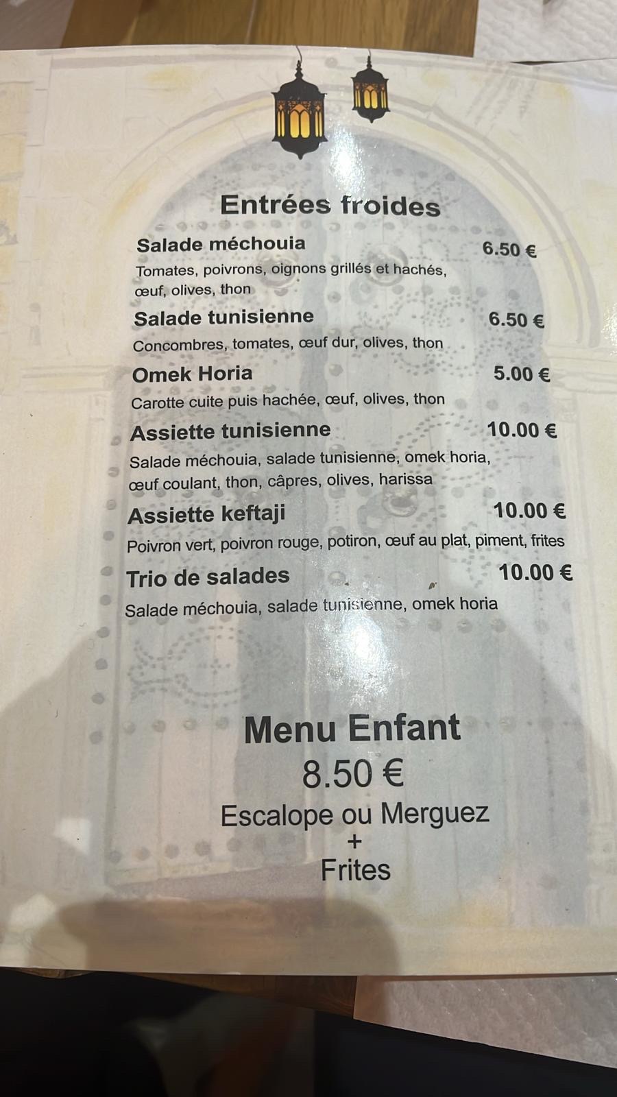 J'ai eu l'occasion de dîner dans ce resto, et franchement, c'était ouf ! Dès que t'entres, l'ambiance te met dans une autre dimension. Les décos super détaillées et la lumière tamisée, tout était parfait pour une soirée au top. Niveau bouffe, c'était un pur régal ! Les plats traditionnels tunisiens étaient juste incroyables. Chaque assiette était un chef-d'œuvre, avec des épices qui faisaient voyager direct en Tunisie. La vraie saveur était là, et ça se sentait que les cuistots y mettaient du cœur. Le menu était vachement varié, de quoi satisfaire tout le monde. Moi qui suis végée, j'ai trouvé plein d'options qui gardaient les saveurs authentiques tout en régalant mes papilles. Le service, nickel ! Les deux serveurs étaient aux petits soins sans être intrusifs. Toujours là quand t'avais besoin, avec le sourire en prime. Ils faisaient tout pour que t'aies tout ce qu'il te fallait, tranquille. Bref, c'est un bijou caché qui offre un moment de bouffe inoubliable. L'ambiance, les plats, l'authenticité, le choix, et le service au top, tout est au rendez-vous pour une soirée mémorable. Je le recommande grave à ceux qui veulent découvrir la cuisine tunisienne dans une ambiance cool et chaleureuse
