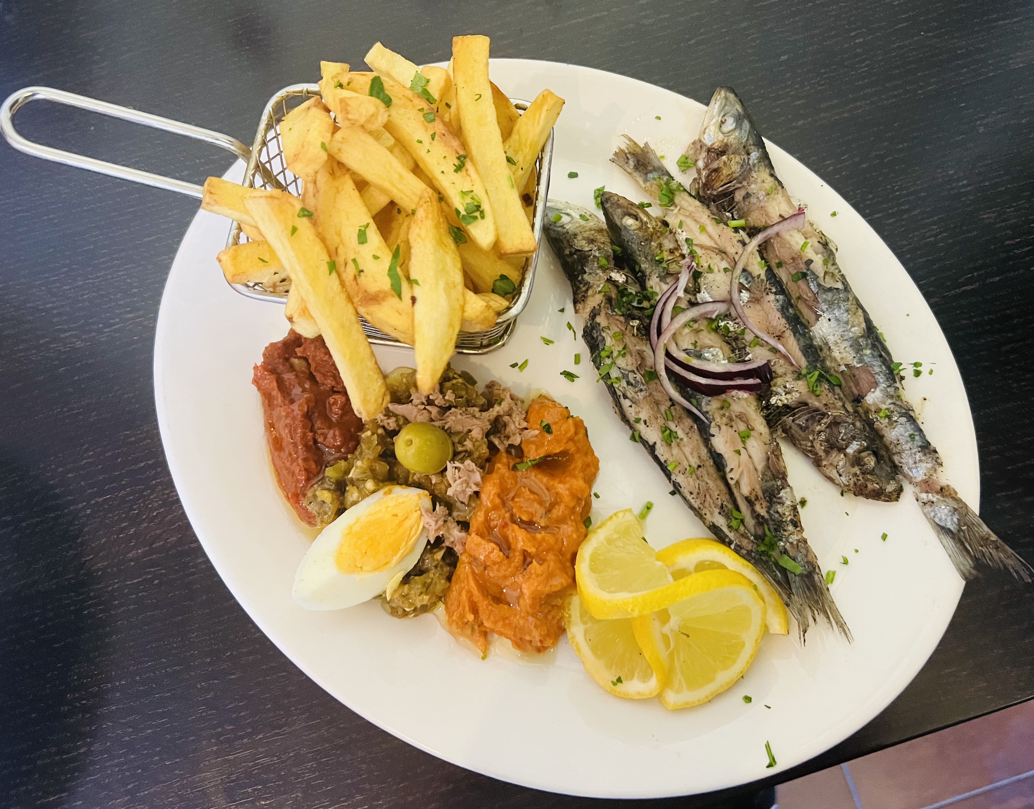 Je ne comprends pas du tout les 5 étoiles donnés sur les quelques avis Cela doit être des connaissances au resto. Car c'est vraiment pitoyable, tout est à améliorer vraiment TOUT ! J'ai rien à dire de plus Je vais juste mettre une des assiettes que nous avons commandé et vous jugerez vous même Entrée salade méchouia ..