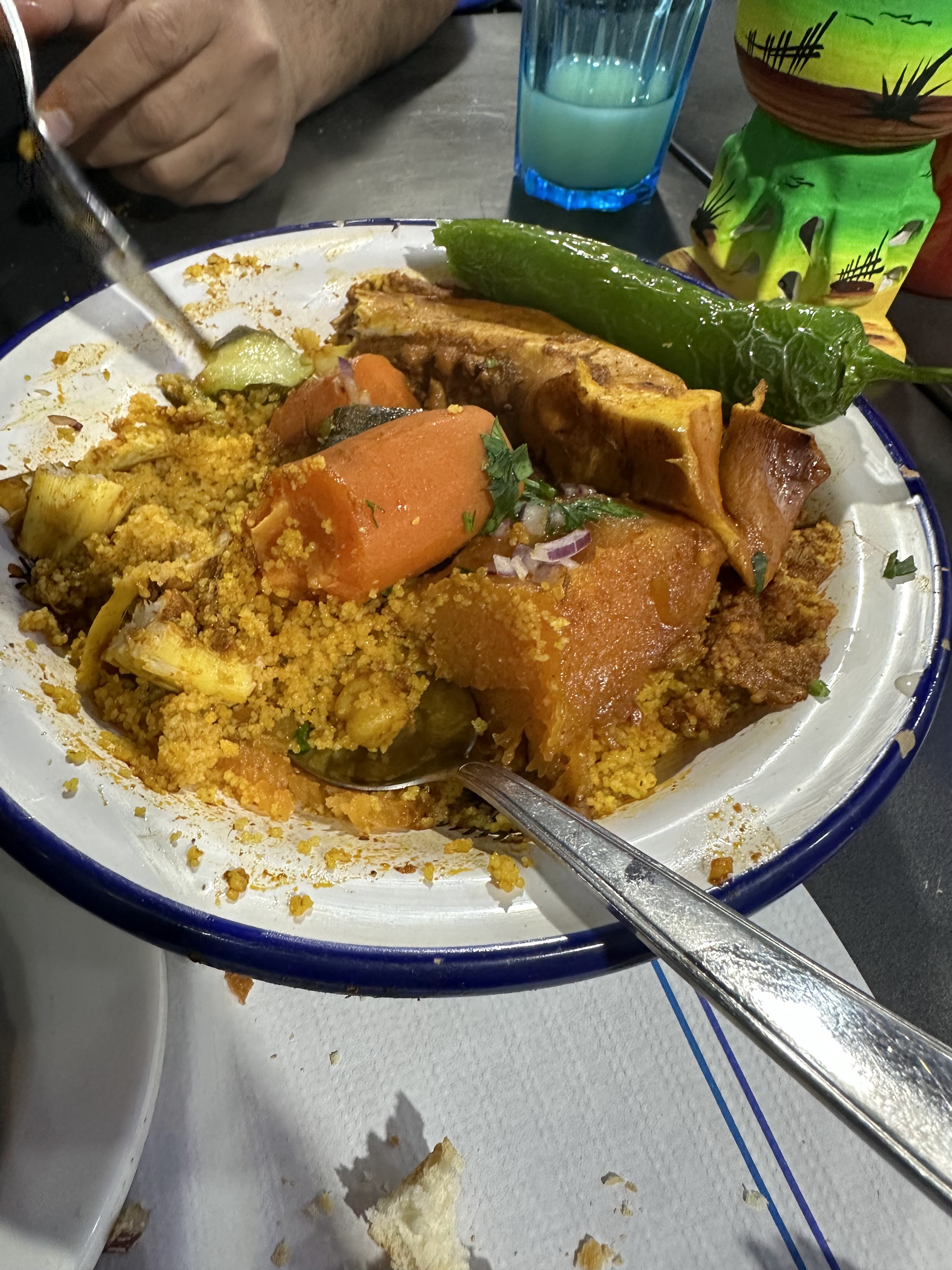 Je suis aller avec ma mère , elle a pris chorba poisson + kemounia et moi un couscous poisson c’était magnifique