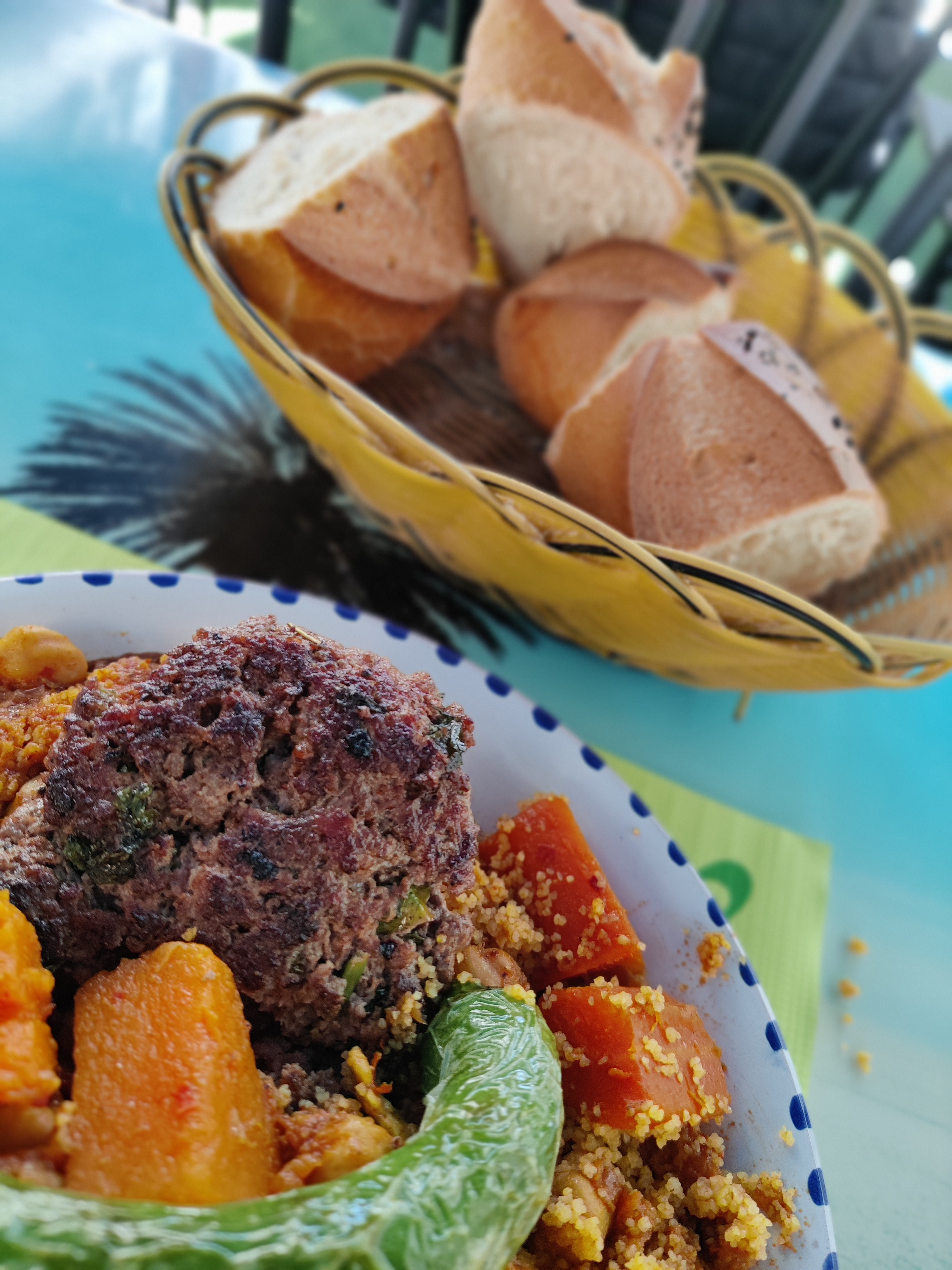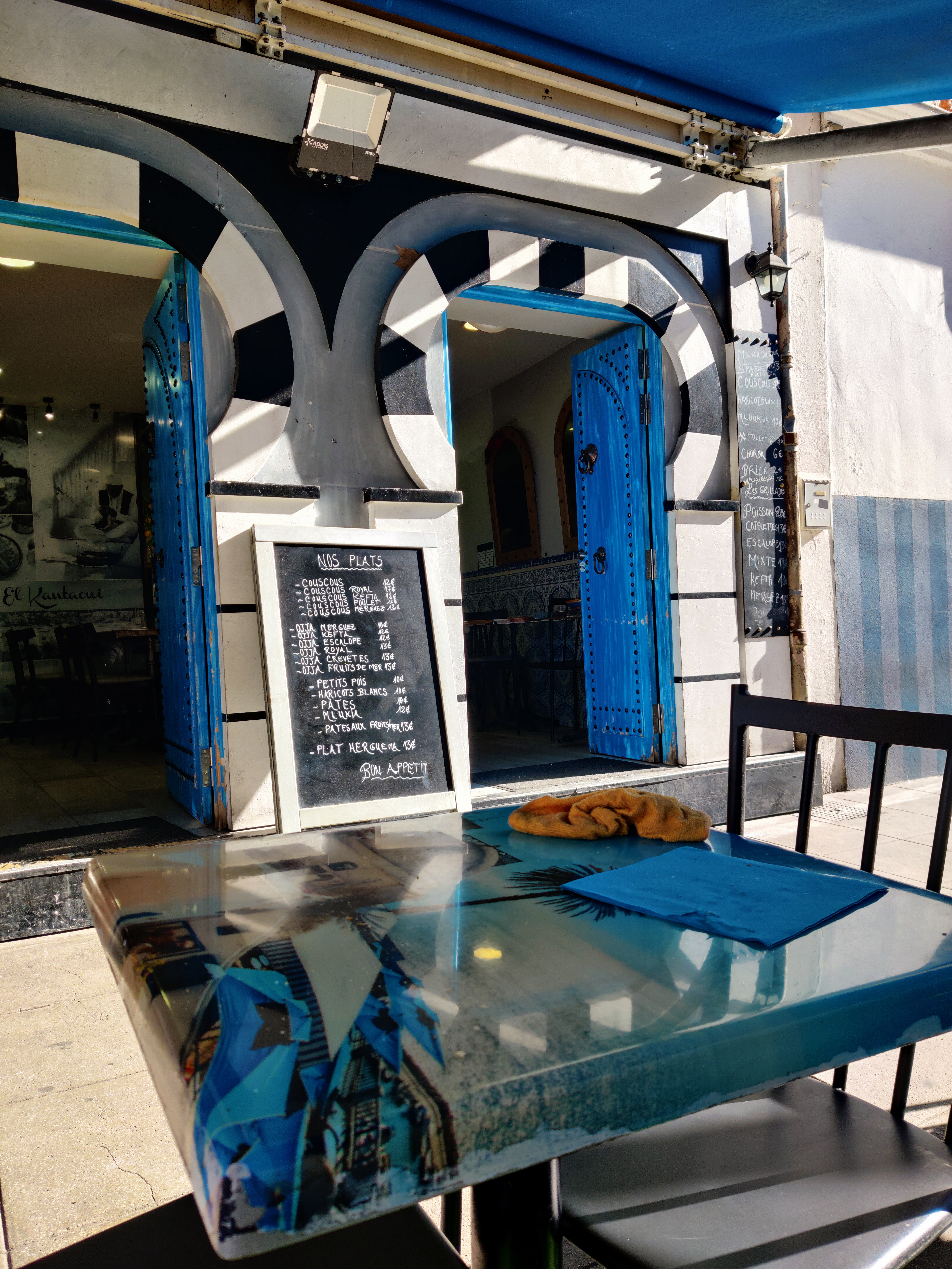 J'étais passé devant cette jolie façade sans m'arrêter et aujourd'hui je suis venu déguster un couscous (12 €). Ici on ne fait pas de manières pour l'accueil comme pour le service. Le couscous est généreux. Il est simple mais délicieux. Le pain qui l'accompagne est parfumé. Sur la terrasse, au soleil ou à l'ombre du grand store couleur bleu-Sidi-bou-Saïd, l'ambiance est tunisienne. Merci pour ce bon moment ☺️