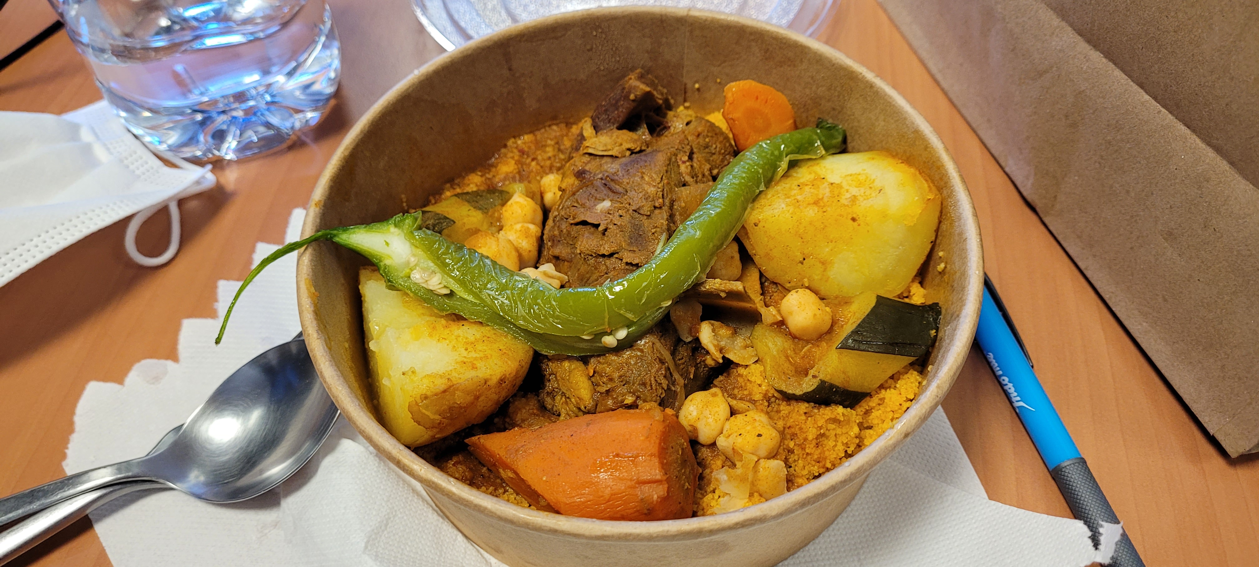 Attirés par les bonnes notes, nous sommes venus prendre 2 formules couscous+ 1 brick. Déjà les prix ne sont pas ceux que vous trouverez sur internet. Pas de soucis a priori, je préfère prévenir les gens qui pourraient être surpris. c'est maintenant 15 euros le couscous, ce qui est au dessus de pas mal de prix pratiqués a Paris par exemple. Si vous voulez la formule avec une brick et une boisson pour le même prix, tant mieux. Autrement le couscous est quand même a 15 euros si vous ne voulez pas de formule. Nous n'en voulions pas mais l'avons prise car ça ne coûtait rien de plus. Les bricks sont bonnes. Pour le couscous, il faut prévenir que c'est un couscous tunisien : pas de jus de légumes et une graine de couscous assaisonnée, pas nature comme chez d'autres pays. Mais aucun problème avec ça. Autrement, vraiment déçus : a ce prix, vous avez une portion d'agneau assez modeste, beaucoup de semoule, et littéralement 1 petit morceau de courgette, 2 petits morceaux de carottes, 1 demi grosse Pomme de terre et 1 demi piment. Et ce n'est pas une exception car les 2 couscous avaient exactement les mêmes quantités de légumes. Honnêtement du mal à voir ce qui justifie ce prix, d'autant plus a emporter. Je travaille en restauration et connais le métier. Je ne laisse jamais d'avis habituellement même lorsque je suis déçu, mais cette fois ci je suis réellement frustré tant je m'attendais à un repas différent avec ces avis élogieux. Les légumes ne coûtent pas cher, pourquoi économiser la dessus ? Quand on prévoit un couscous, c'est pour ses légumes autant que pour le reste. Je n'y retournerai pas. Je souhaite a l'équipe du restaurant de réussir, surtout en cette période, mais svp mettez vous aussi à la place de vos clients.