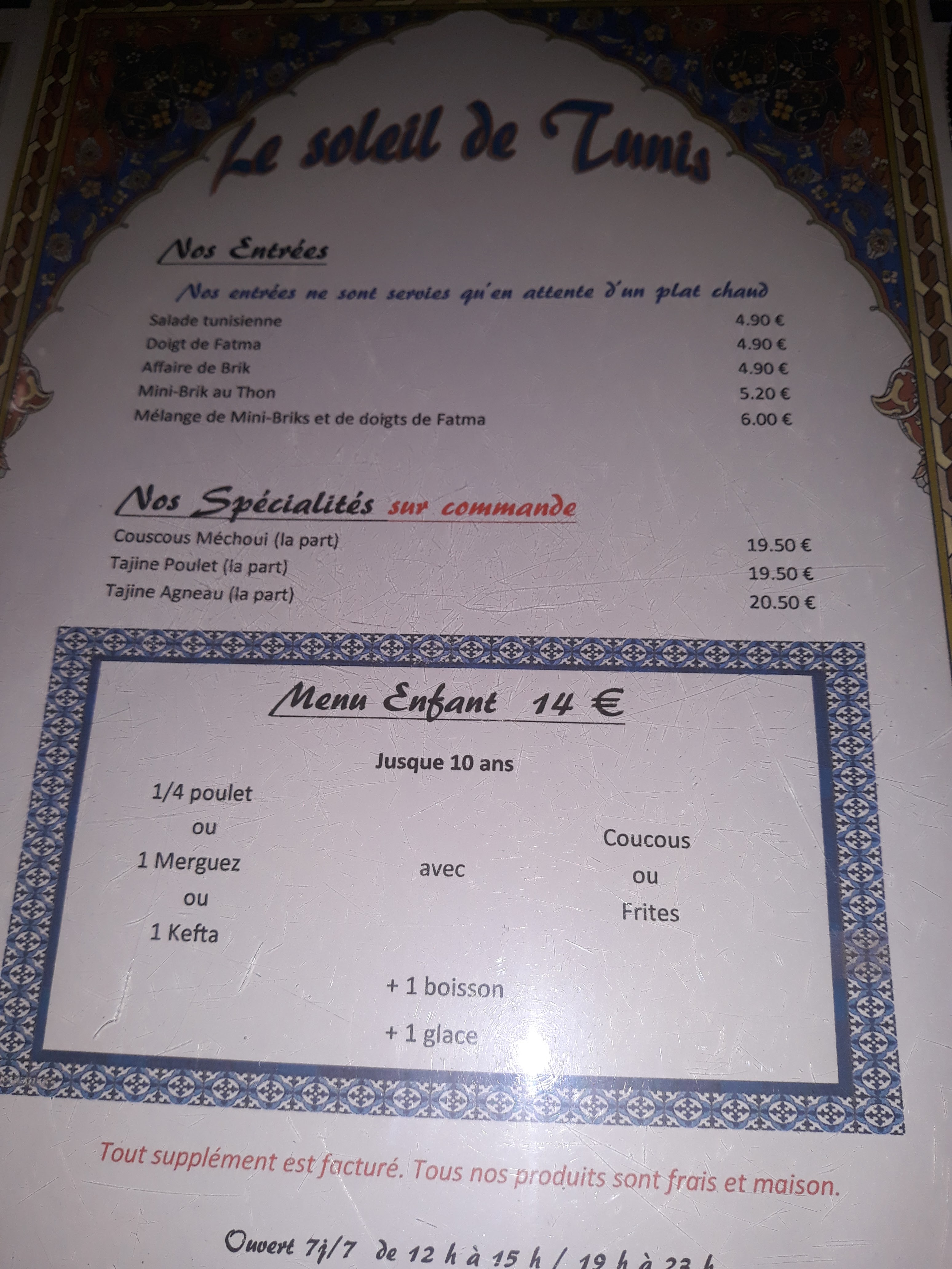 Très surprise par votre avis qui est à prendre avec beaucoup de précautions. Vous n'avez pas aimer nos amuses bouches fait maison? Qui de plus vous sont offerts! Il est vrai que c'était plus simple et moins onéreux de mettre des cacahuètes. Vous parlez des bricks mais si vous connaissiez réellement la cuisine tunisienne, vous sauriez que c'est le mode de cuisson le plus généralement utilisé. Pour la mozzarella et la merguez , excusez nous d'innover et de varier;Quand au prix, il est le même que nos confrères et également affiché dehors. A l'avenir éviter les conseils du genre changer de cuisinier, je pourrai aussi vous proposer de changer vos gouts. Et pour finir, la seule prétention que nous avons et de cuisiner des produits frais et fait maison. D'ailleurs je vous conseille d'autres établissements et vous invite à ne plus revenir dans le mien. Cordialement les chtis tunisiens et bonne année ;