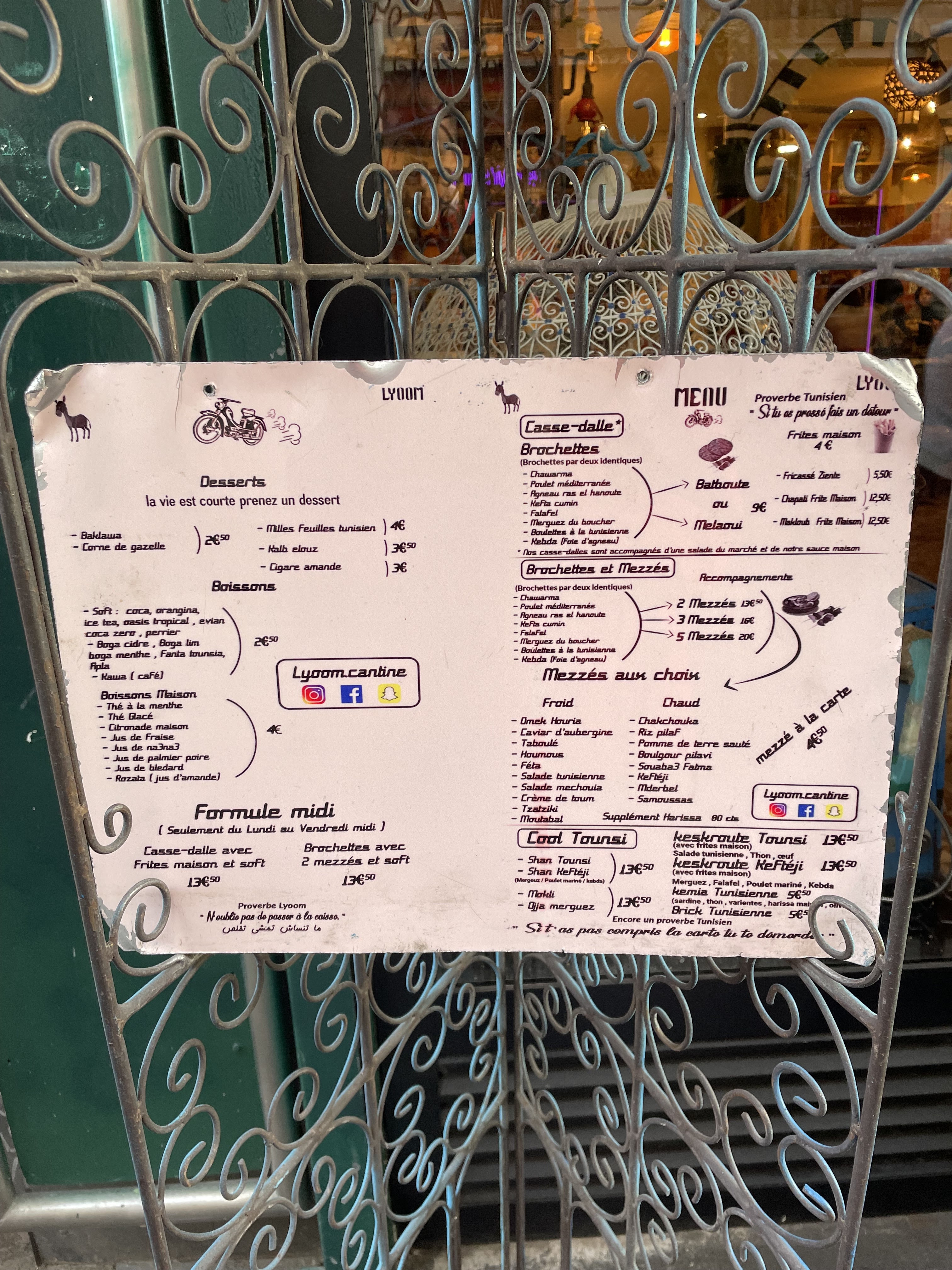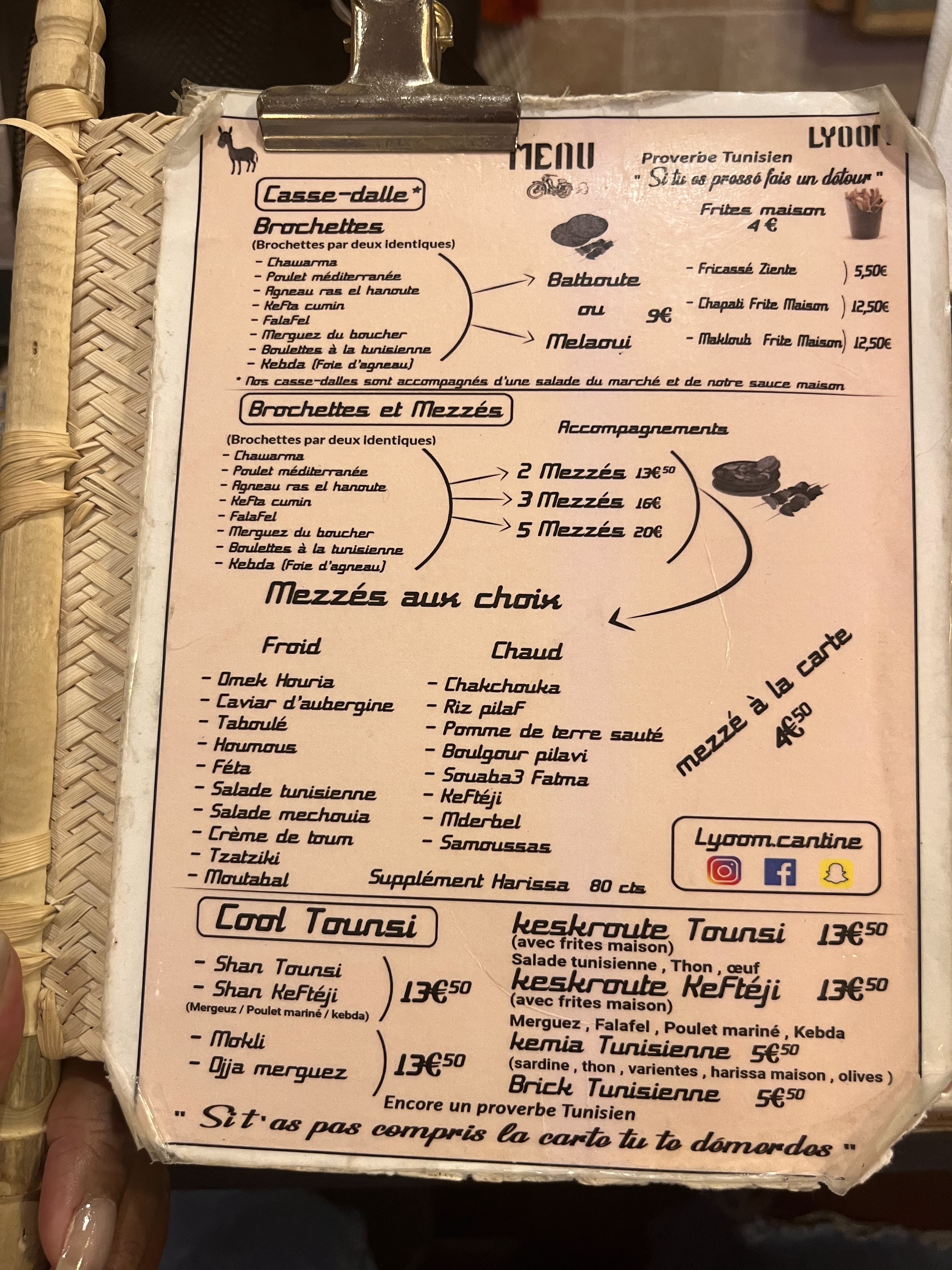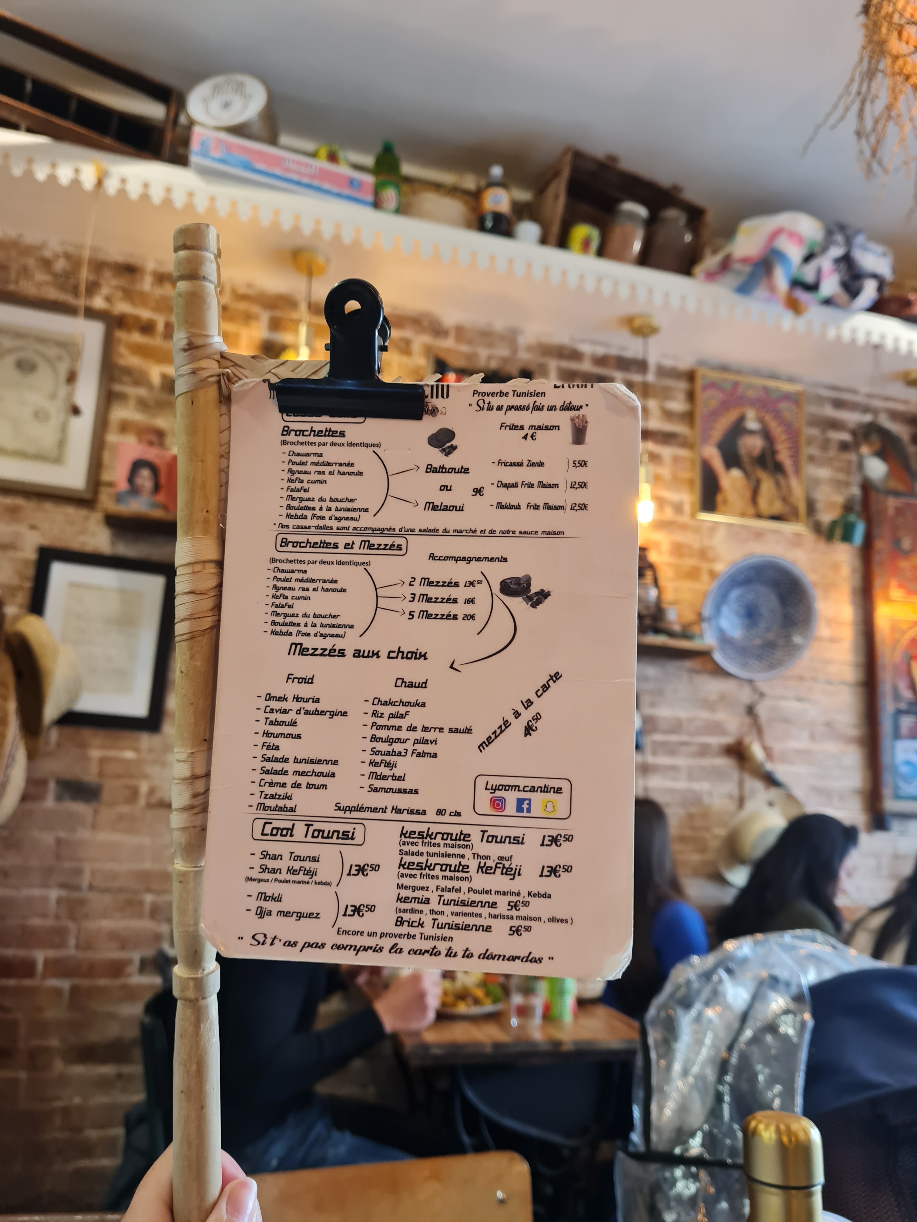 Vous recherchez une cuisine originale à tester à Paris ? Offrez-vous une escapade tunisienne !🏝️🇹🇳 Lyoum cantine est bien plus qu’ un restaurant, dépaysement assuré. Cuisine relevée mais il y aura toujours une salade fraîcheur, une frite maison pour adoucir vos papilles 🌶️ et les brochettes sont bien assaisonnées !