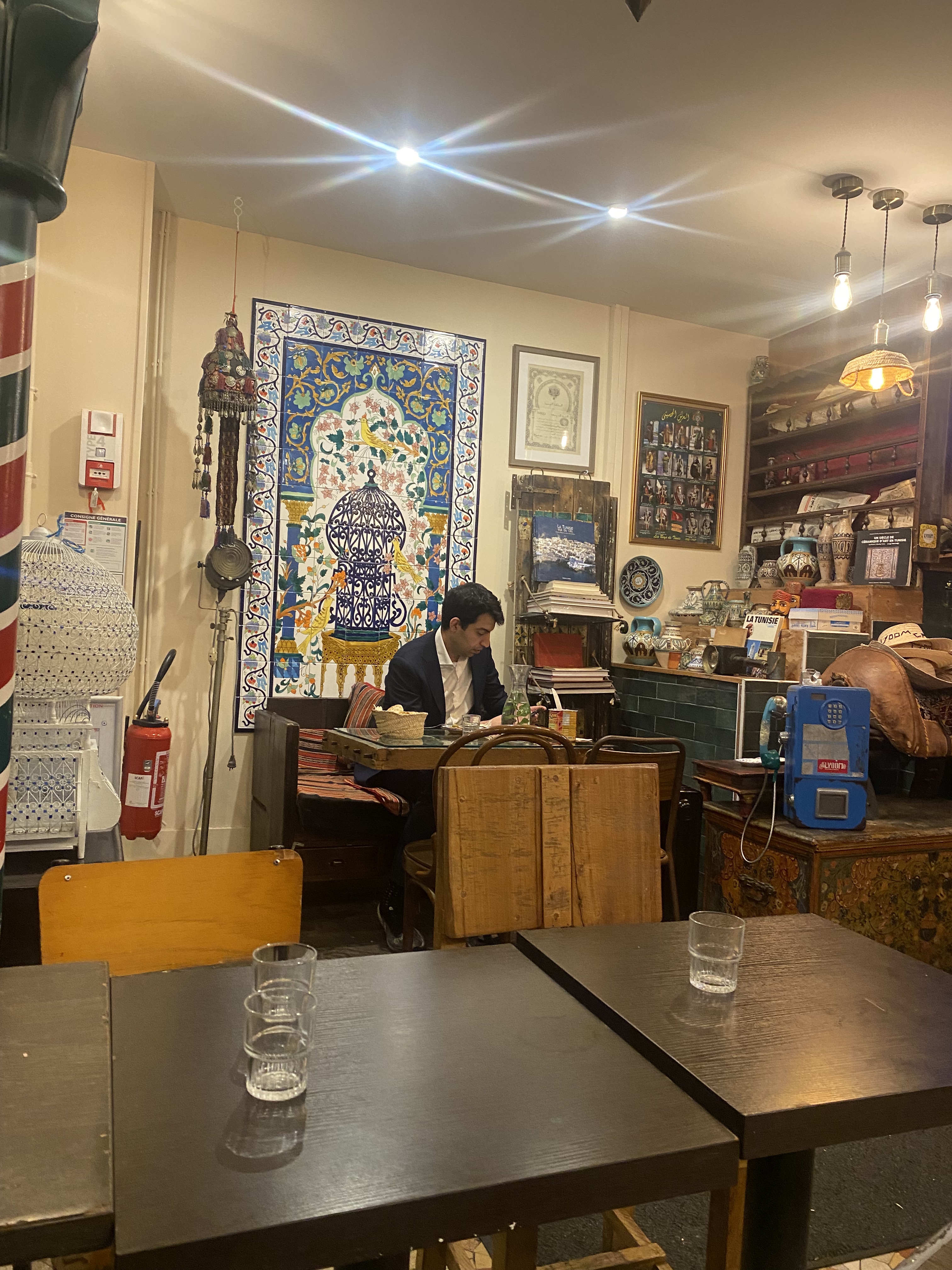 J'ai beaucoup aimé le décor très représentatif, c'est certes petit mais les tables sont très bien rangés et une fois assis on a aucun problème à déguster les différents plats et je veux dire bravo au personnel pour l'accueil et le service. Ce que j'ai aimé : Service rapide. Serveur très cool et disponible. Carte facile à comprendre. Plats très beaux/bons (visuel et goût). Ce que je n'ai pas aimé : Je suis peut-être un gros mangeur mais j'ai trouvé la quantité un peu légère (cela dit j'ai pris 2 mezzés seulement mais j'ai pris des frites et une brick en complément). Le prix un peu élevé je pense. Je vous conseil d'essayer.