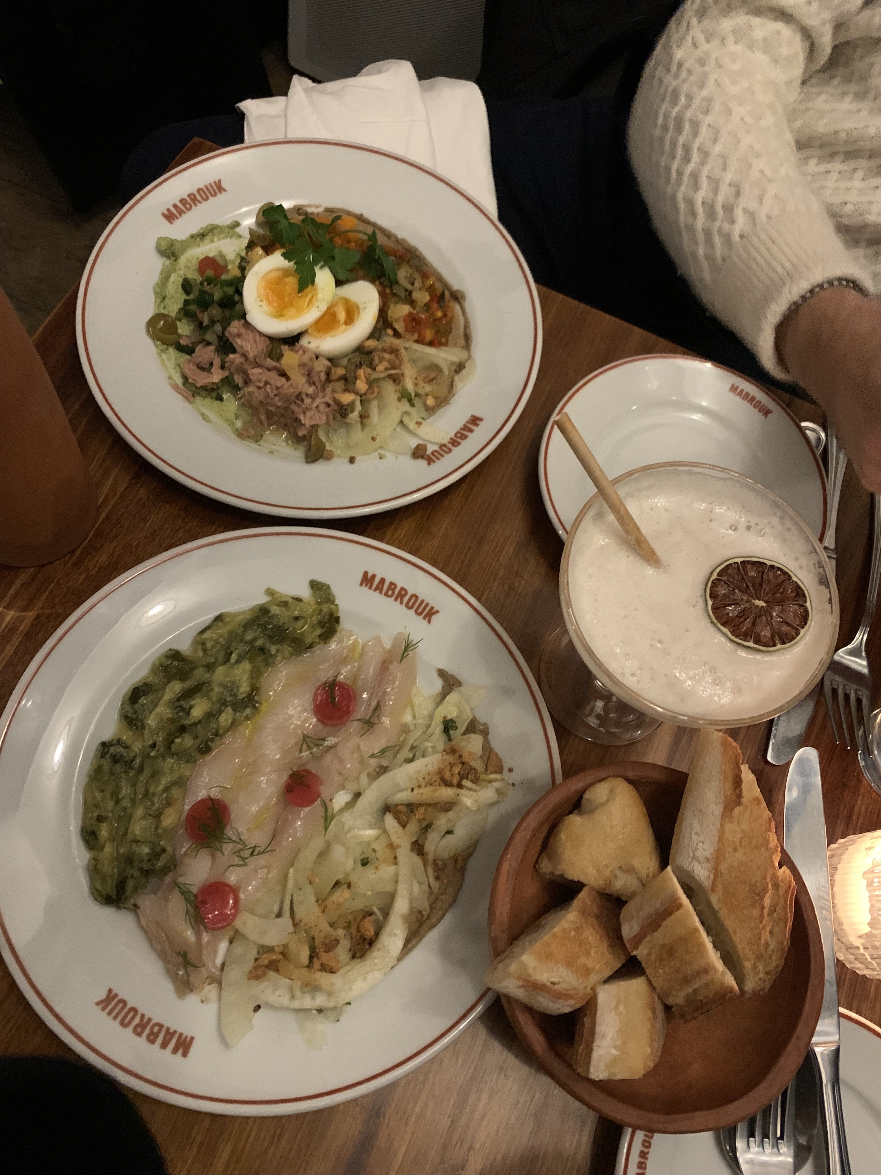 J'avais hâte de tester Mabrouk car on m'en a beaucoup parlé. Etant tunisienne, j'étais très heureuse de voir qu'il y avait un nouveau restaurant tunisien, différent de ce qu'on a l'habitude de voir à Belleville. Le restaurant est très joli et la carte donne vraiment envie de tout essayer. Nous avons commandé une grande variété de plats pour gouter à tout. Certains plats sont très réussis comme le sidi bowl said quand d'autres sont complétements ratés comme les briks ( cramés ). Il est à noter que ce ne sont pas du tout des recettes tunisiennes traditionnels mais plutôt de grosses revisites. Je pense que les prix sont à revoir. Une mini brik ( entrée) à 8€ ou une assiette avec 2 merguez ( entrée) à 8€, c'est quand même exagéré. Une baisse de 20%-30% minimum est à appliquer. Rien à dire sur les serveurs, le service est excellent. Bref, c'est quand même un spot à essayer si vous voulez manger tunisien dans un endroit agréable et original.