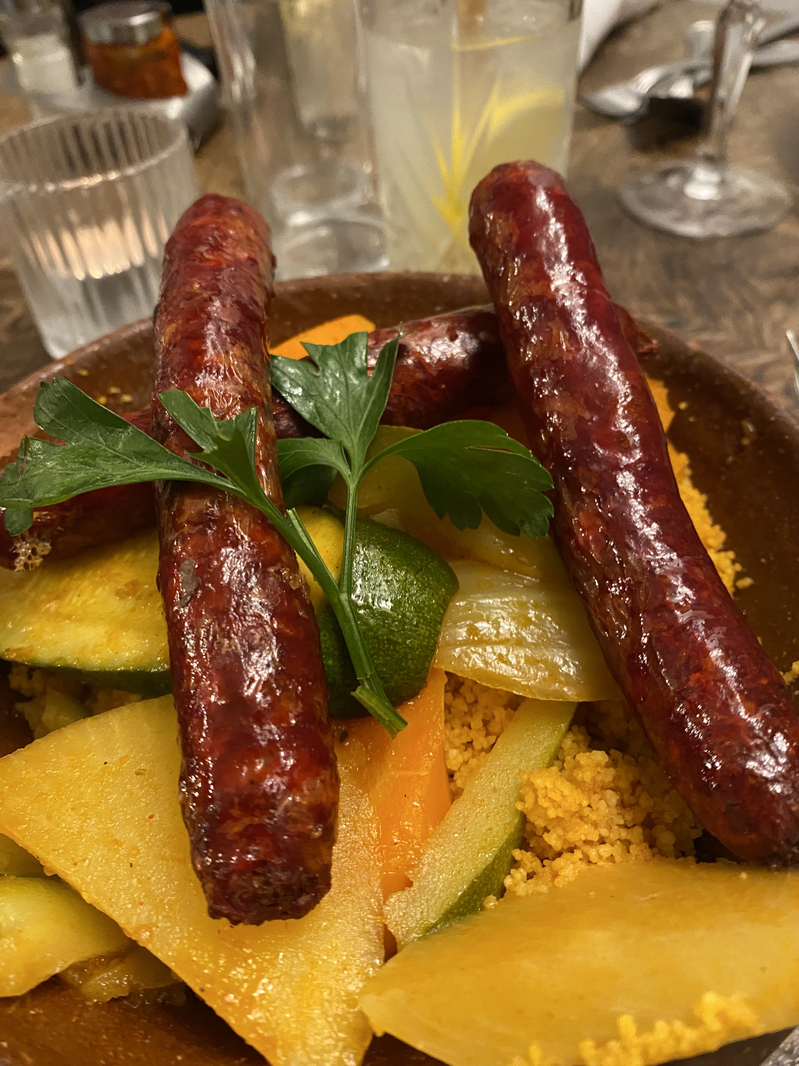 Le style et l’ambiance sont plutôt agréable, nous avons été très bien reçus. La promesse d’un voyage culinaire fleurait bon portée par les épices. Les briques étaient bonnes, rien de bien rare mais nous nous sommes régalés. Nous avons ensuite cédé à l’appel du couscous royal. La description nous a fait saliver, et de la salive il en a fallu pour manger ce plat. Sec et avec une viande qui semblait avoir été dix fois réchauffée. Les boulettes de viande auraient pu servir de projectiles et les merguez de bâtons. D’ailleurs, sur la photo, vous verrez « la peau » de la merguez qui se détache de la chair complètement desséchée. C’est aussi révélateur de la qualité de la saucisse, un véritable boyau ne se comporte pas ainsi. Dommage car les filles se sont vraiment régalées des beignets tunisiens en dessert. Un barman s’affairait derrière le bar à composer des cocktails, apparemment avec un certain brio. En conclusion, c’est une adresse sympa pour l’ambiance mais si vous cherchez le meilleur couscous de Paris, passez votre chemin