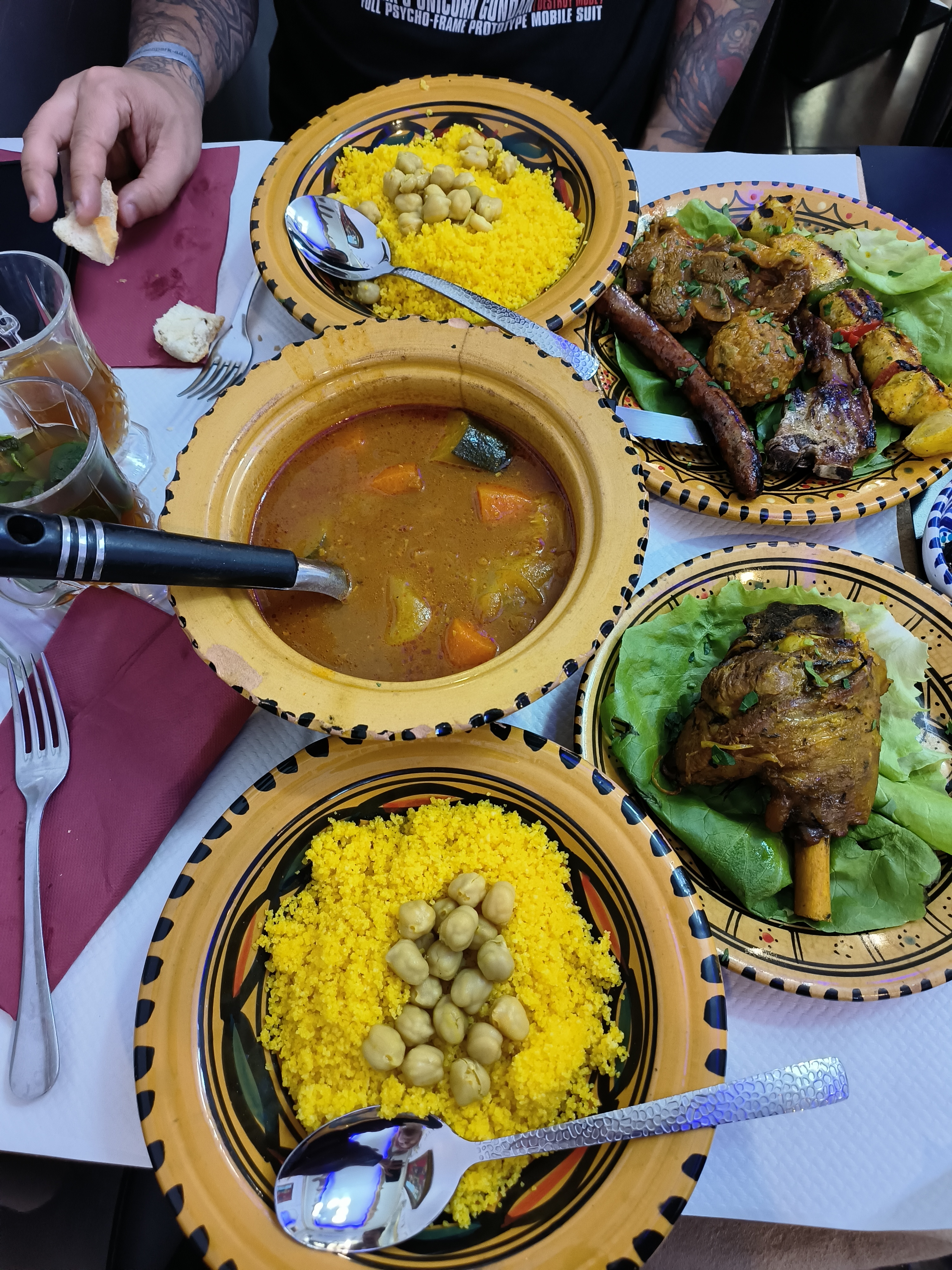 Patron très agréable et accueillant. Rapport qualité prix excellent. On mange très bien, j ai pris tajine poulet et mon conjoint couscous 3 viandes, des assiettes bien rempli. Le thé parfait. On recommande 👍🏼🙂