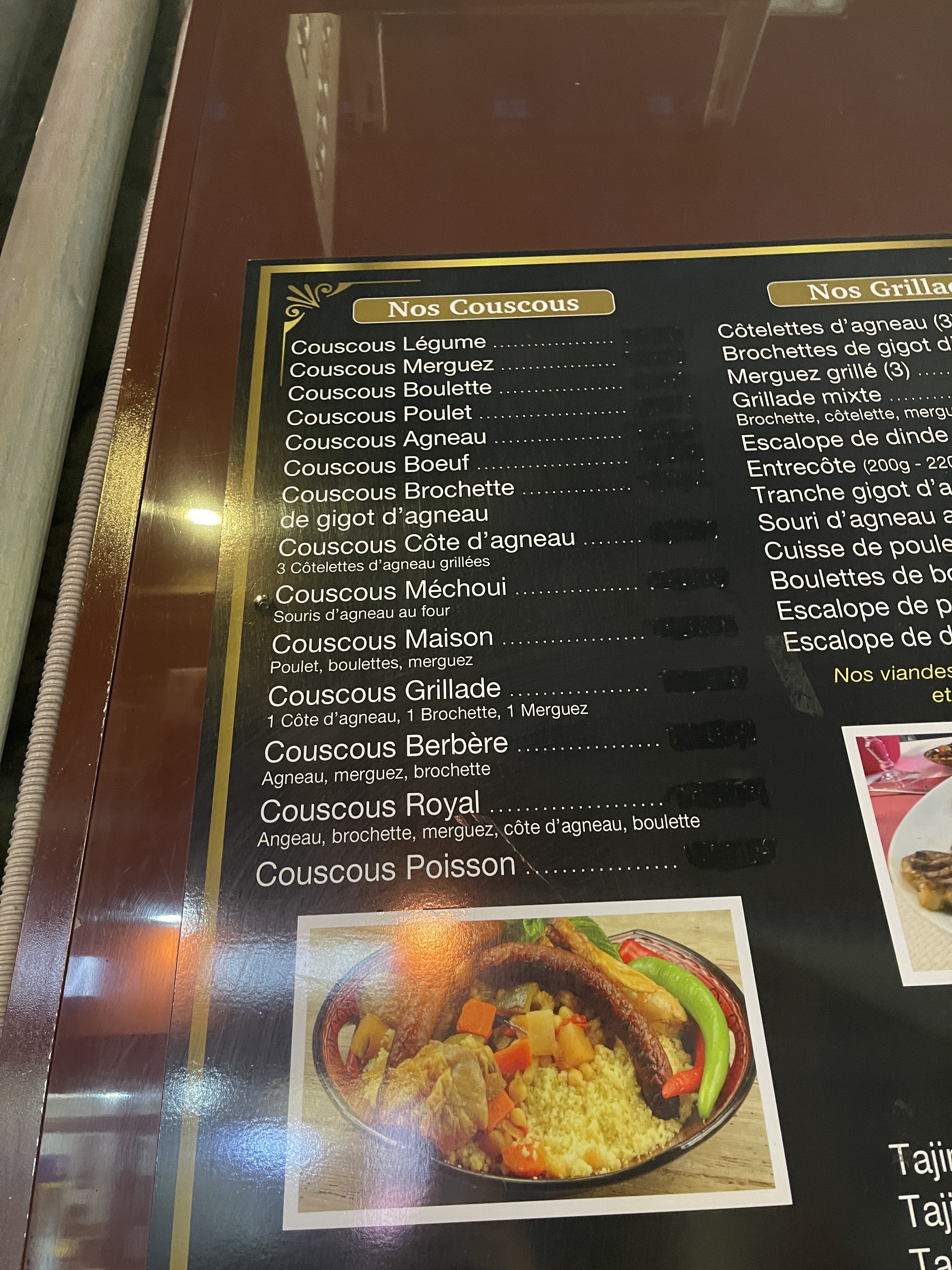Connu pour ses différents couscous, le restaurant propose du foie et du cœur 👍