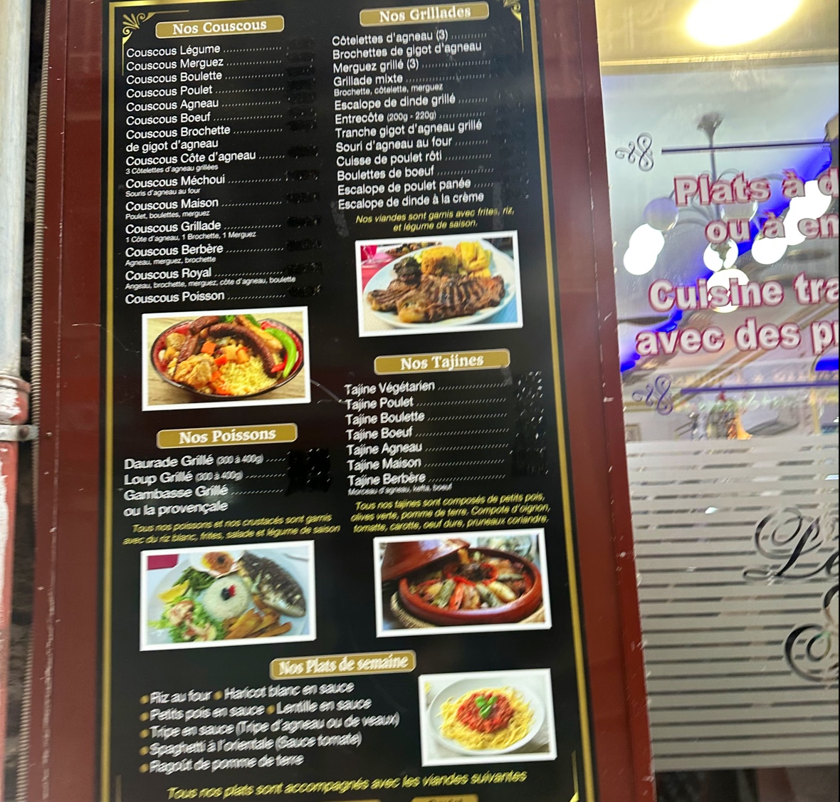 Important de préciser qu il y a eu un changement de propriétaire il y a 1 mois. Nous y sommes allés confiants par rapport à la note.Une déception du début à la fin! Les menus à la carte ne sont pas disponibles. Couscous peu garni ( beaucoup de semoule, une carotte coupée en 3 et un morceau de courgette) , viande de mauvaise qualité et mauvaise cuisson. Bref, à éviter!