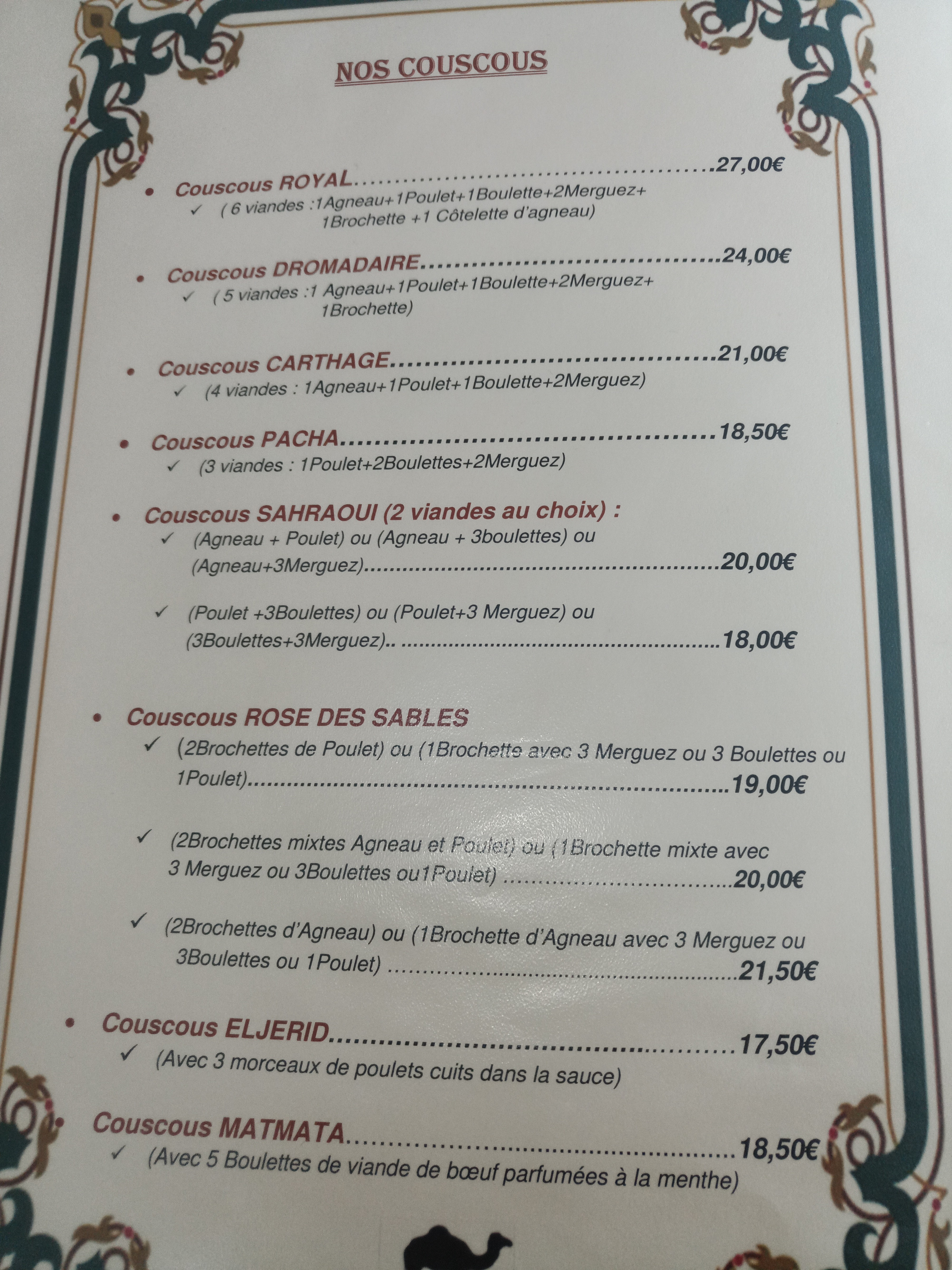 Un peu déçu par notre dernière visite, tant en quantité qu en qualité. Couscous et légumes peu goûteux, petite portion de poulet, merguez qui semblaient recuite, et tranche de méchoui très grasse. Dommage, nos précédents passages avaient été un peu plus appréciés.