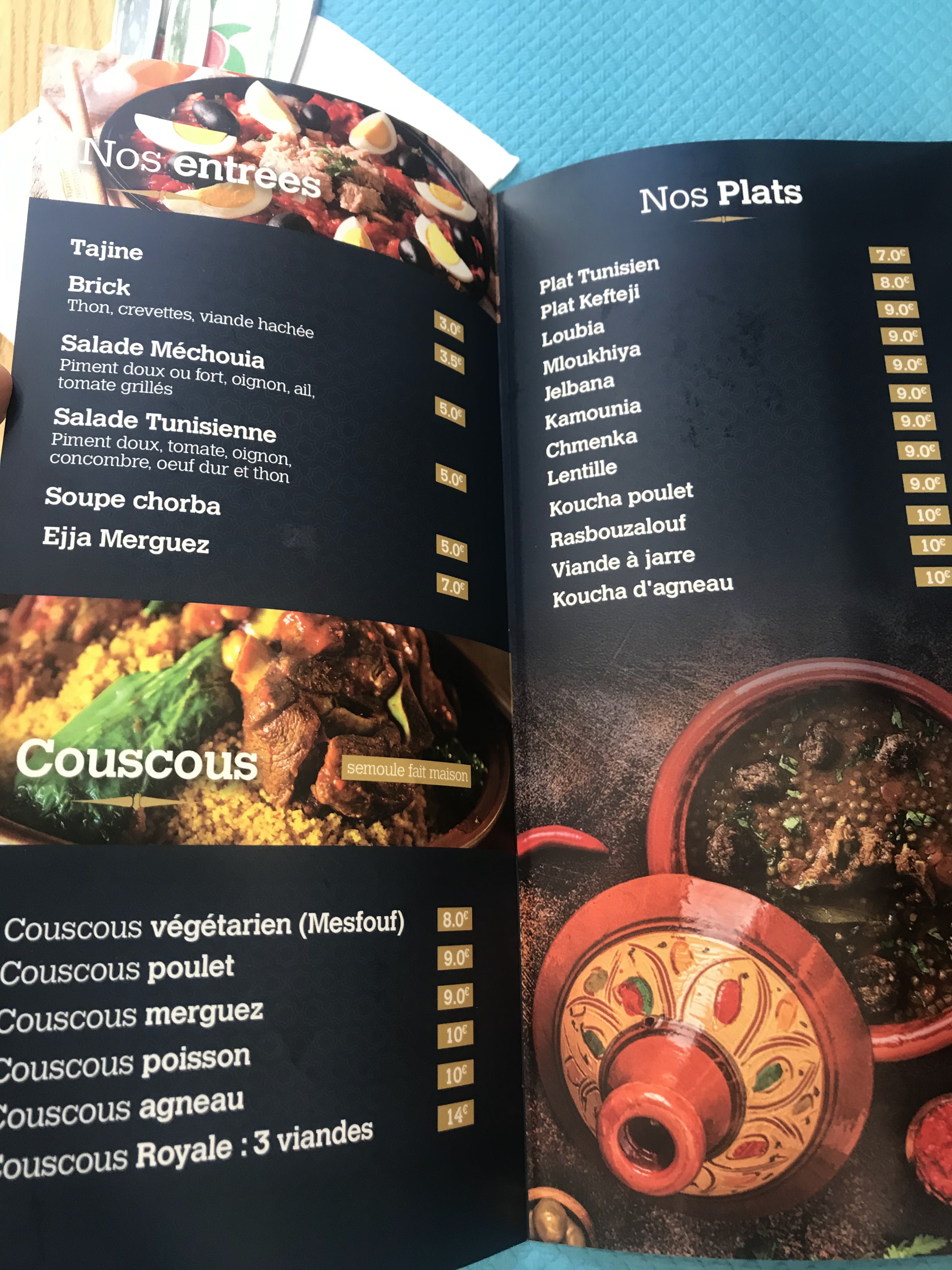 Bonjour Je suis allée dans ce restaurant spécialités tunisienne aujourd’hui. Très bon accueil, couscous agneau et brick délicieuse Prix très abordable Je recommande fortement