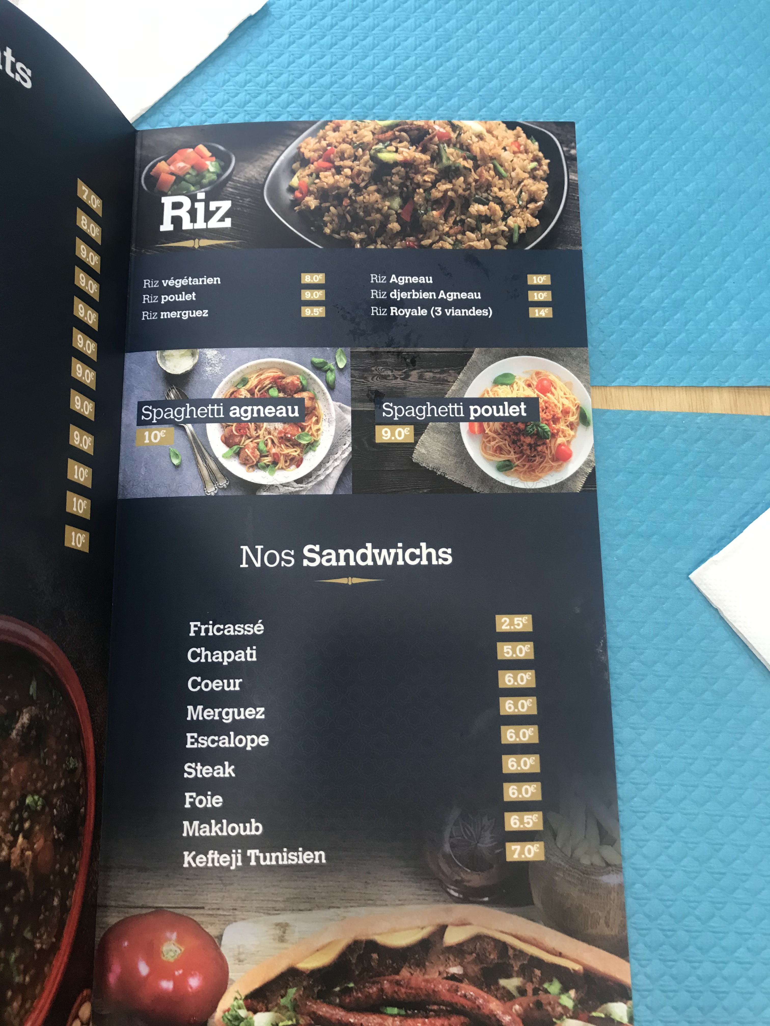 Bonjour ayant visité ce restaurant au mois de juin quand je suis arrivé la personne étant en caisse était pas très accueillant ni de bonjour ni de au revoir dans ma commande se trouver des pâtes tunisienne qui sont réputés pour être bien piquante mais malheureusement aucune épicé n’était présent à part un piment sur les pâtes qui n’était même pas piquant les pates regorger d’huile par la suite la salade il était une toute petite barquette avec une cuillère de légumes et 2 olives . Je ne comprends pas aussi pourquoi il m’a mis une baguette entière alors que la salade était minuscule je ne vais pas manger les pâtes avec la baguette quand même