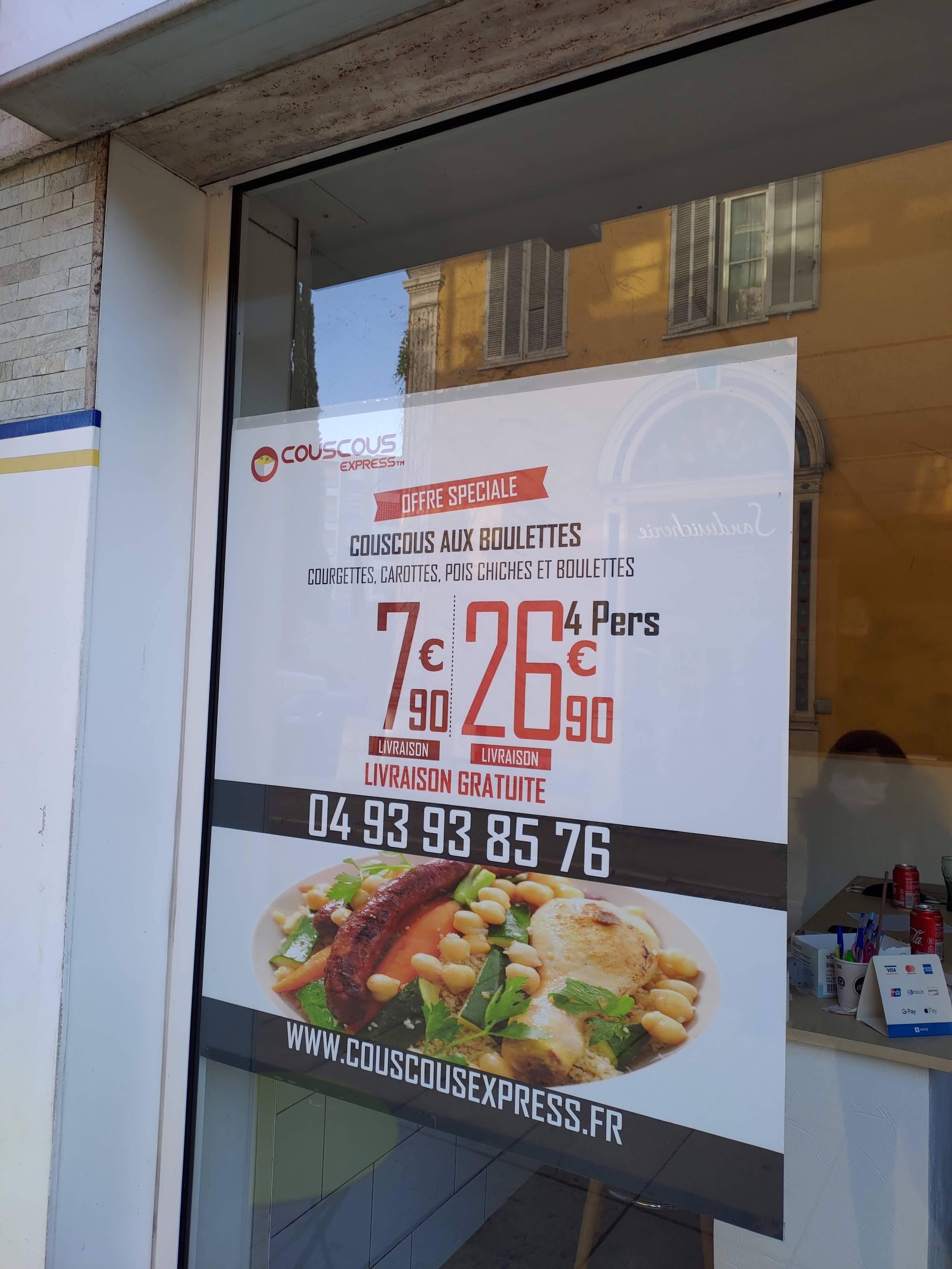 Ayant été satisfait jusqu'à présent de ce petit resto à emporter qui propose des menus très bons et pas cher, il a malheureusement perdu toute ma confiance depuis que n'ayant manger rien d'autres de la journée et après une séance de sport j'ai pensé comme toutes les autres fois me faire plaisir. Moins de 2 h après le cauchemar a commencé pour une nuit de folie à 4 pattes à vomir mes tripes au WC. J'ai crû que j'allais crever cette nuit à cause d'un couscous que je ne suis pas prêt d'oublier car j'ai un estomac en acier qui peut avaler n'importe quoi sauf le plastique, ma dernière expérience de vomissements d'il y a plus de 6/7 ans en arrière ! (Tout de même !) J'en déduis une grave négligence dans l'hygiène... soit une alimentation bien trop vieille ou plutôt avoir laissé tomber par mégarde du papier plastique (de viande ou autre) dans la préparation. Bref, toujours est-il qu'en raison de mon estomac d'acier il est pour moi évident qu'il y a eu un énorme problème d'hygiène... C'est arrivé 1 fois seulement certes, mais ça sera la dernière ! Le couscous ou la Vie ? Je passe mon chemin. Bonne continuation ! (Mais comme j'ai failli appelé les urgences je me devais de vous alerter... et tous). Voilà qui est fait.